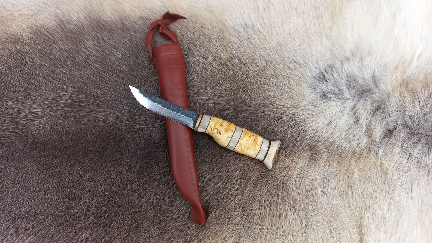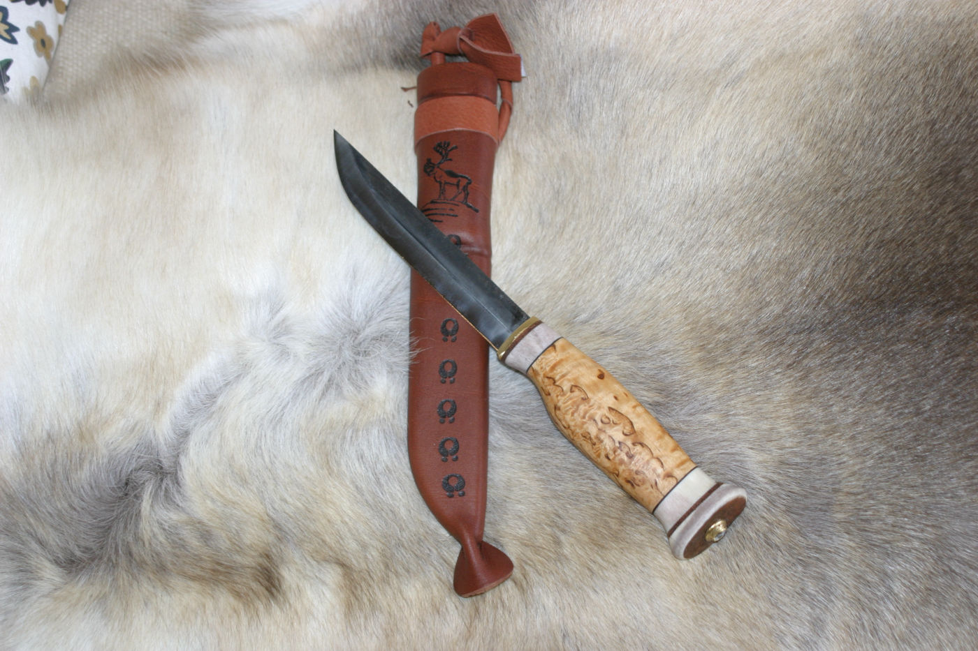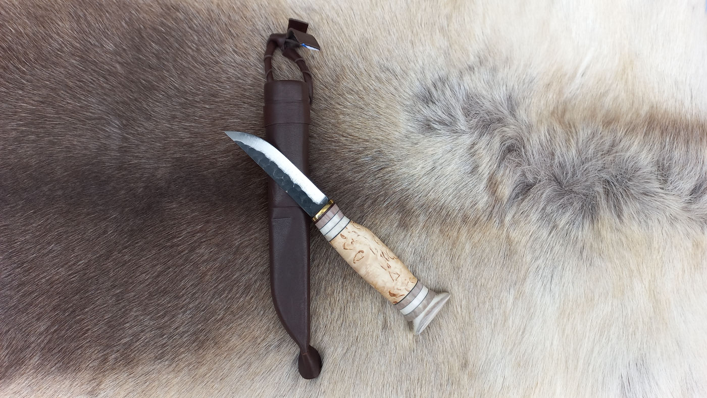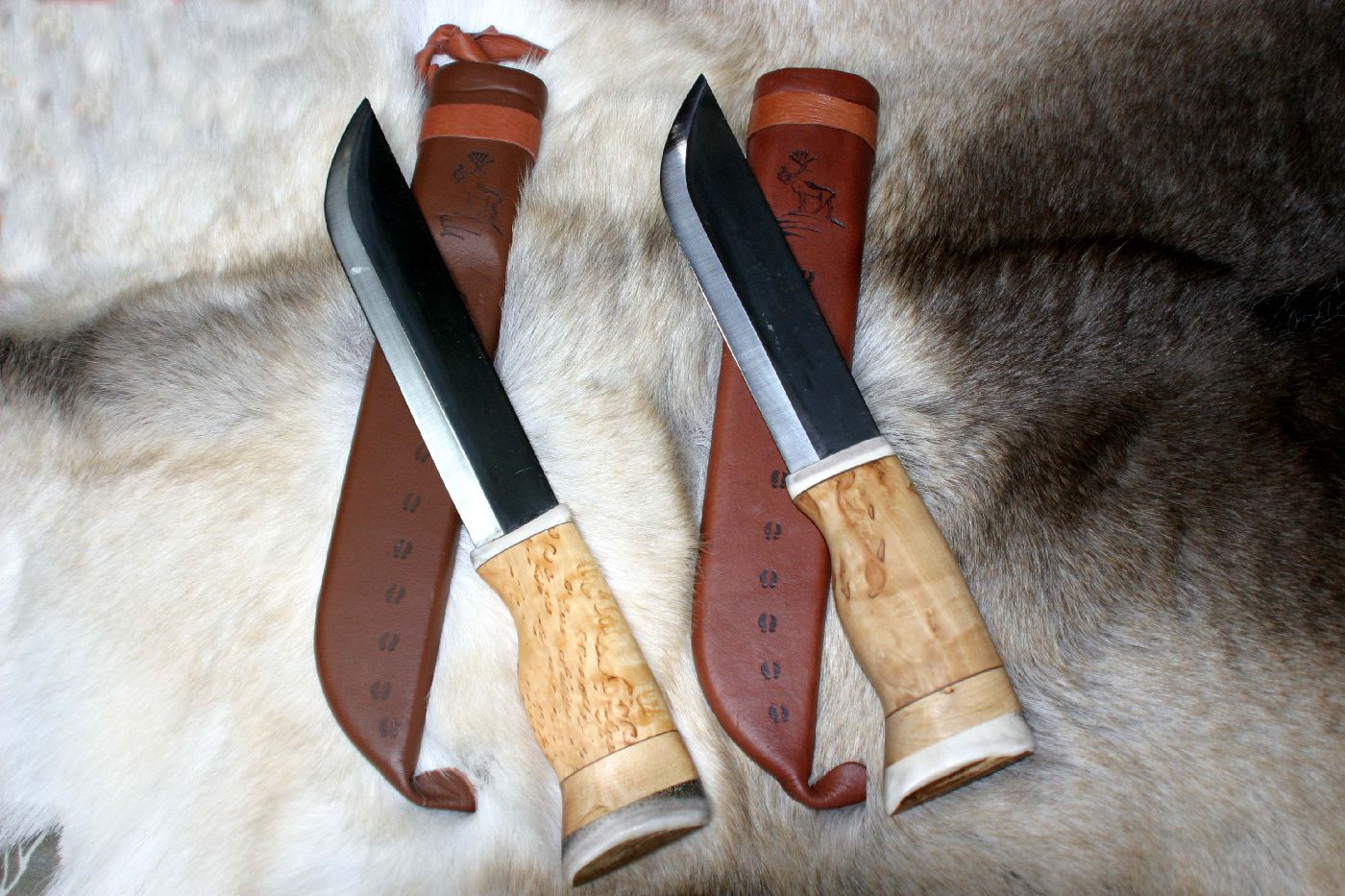 Véritables couteaux nordiques lapons, fabriqués artisanalement en Laponie Finlandaise. Lames en acier carbone sur tous les modÚles, manches en bois de renne et loupe de bouleau, fourreaux en cuir, loupe de bouleau et bois de renne selon les modÚles.
