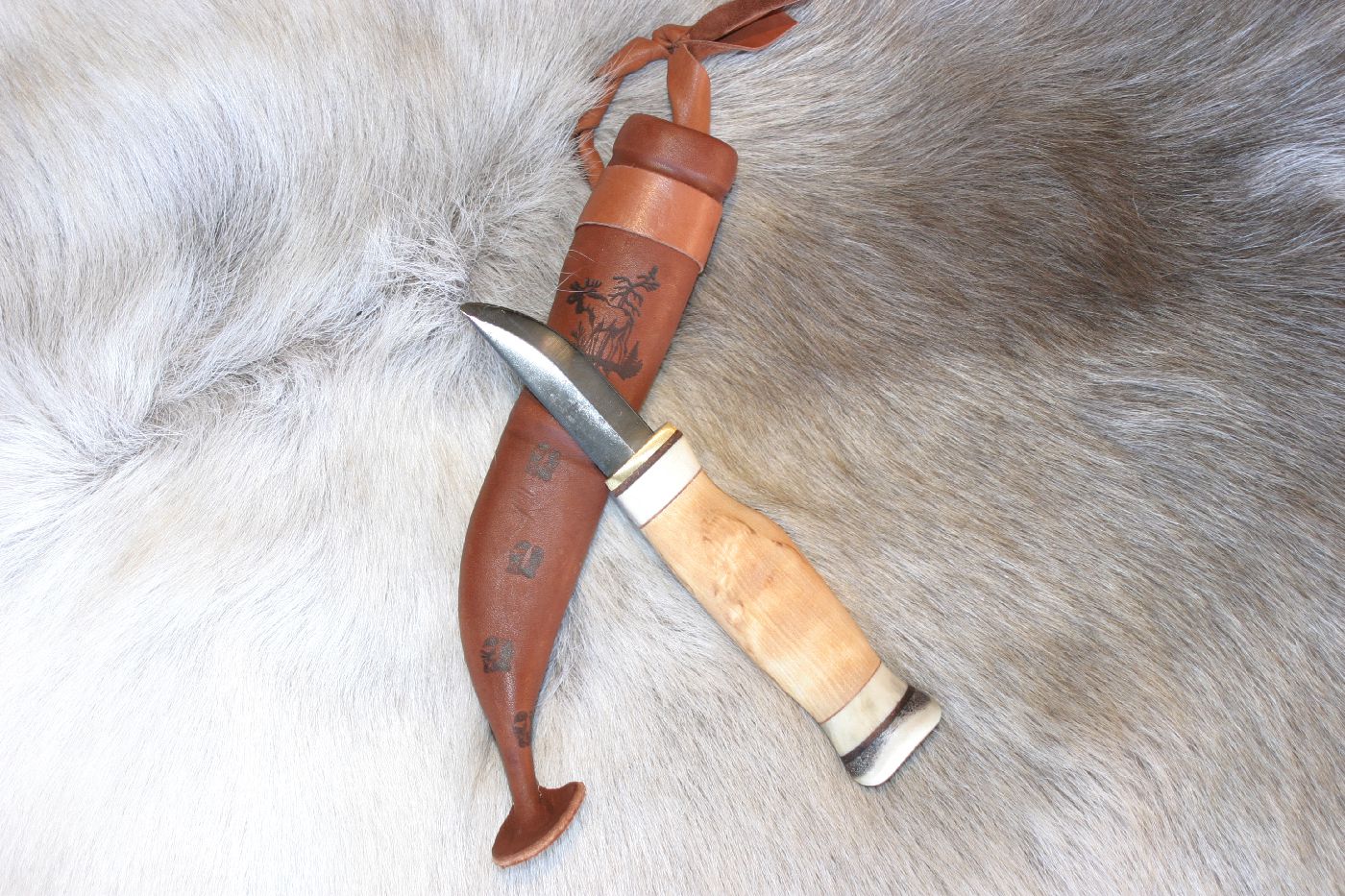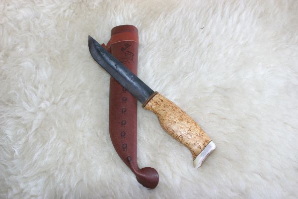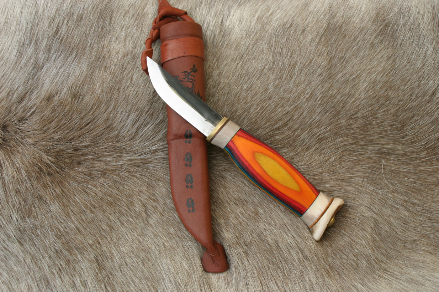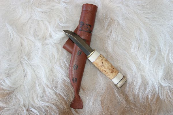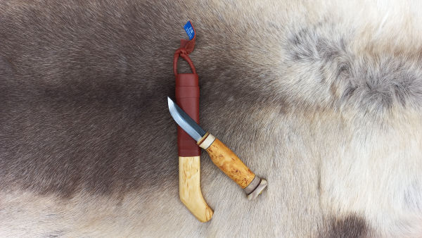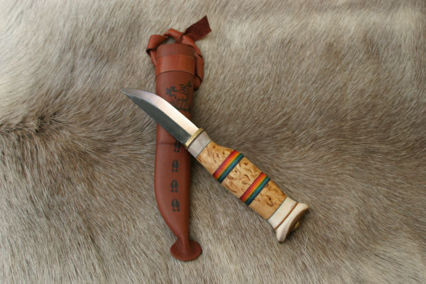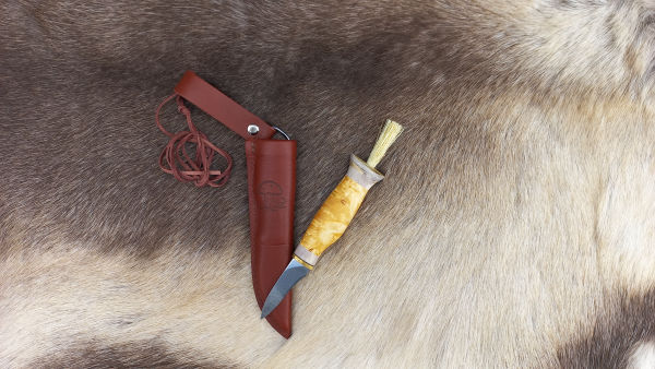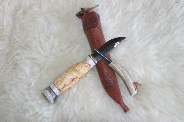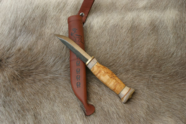 Véritables couteaux nordiques lapons, fabriqués artisanalement en Laponie Finlandaise. Lames en acier carbone sur tous les modÚles, manches en bois de renne et loupe de bouleau, fourreaux en cuir, loupe de bouleau et bois de renne selon les modÚles.