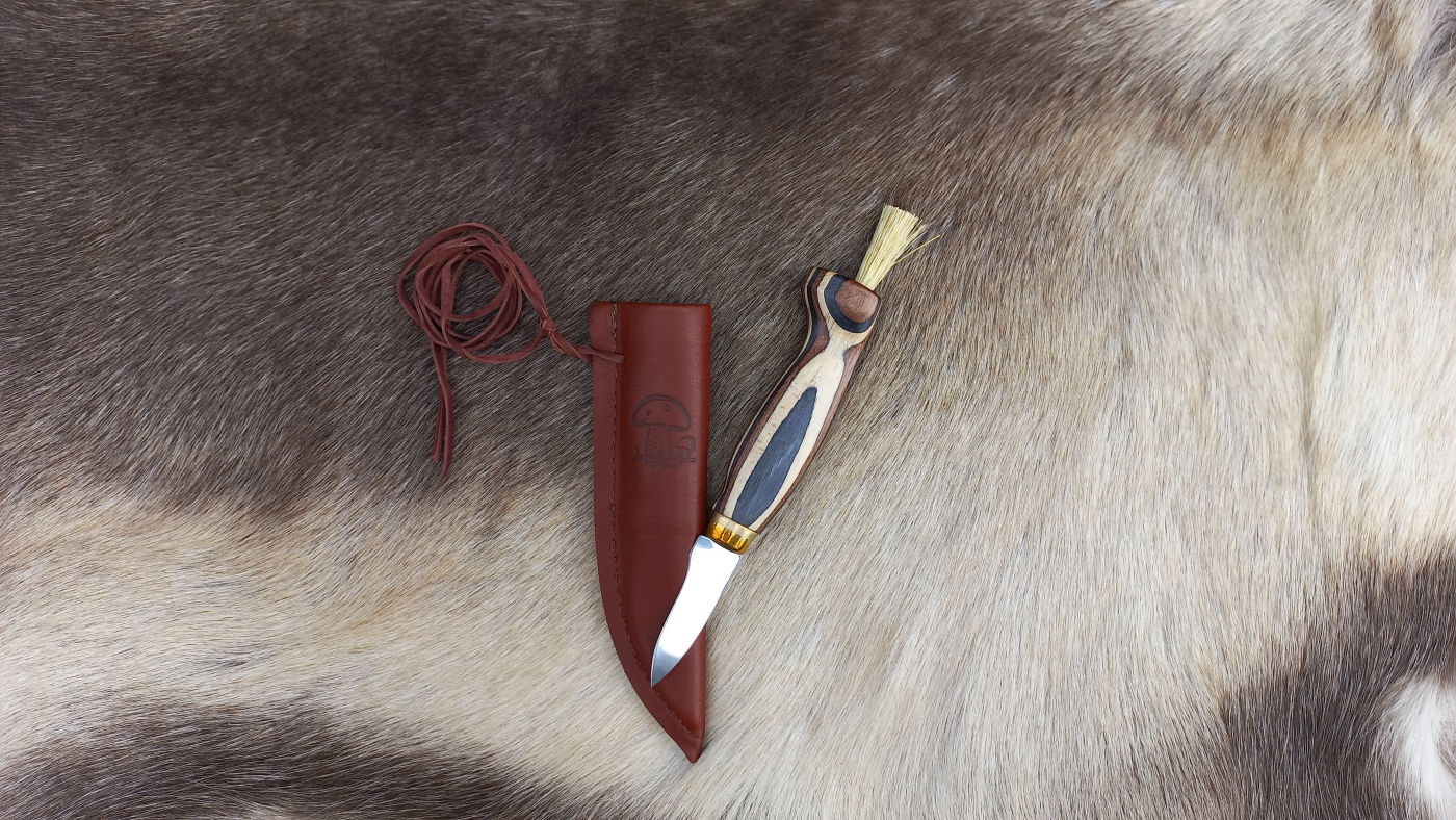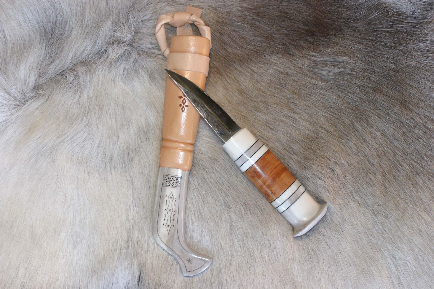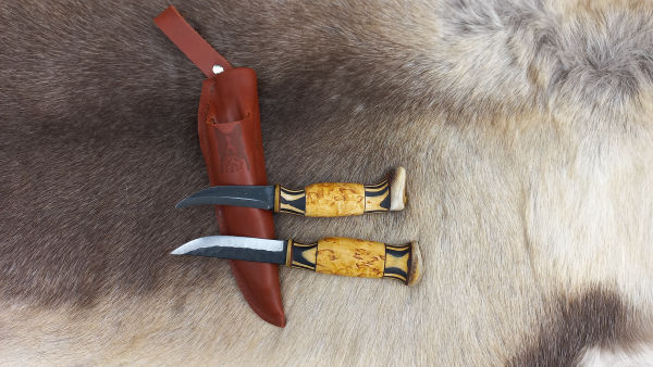 Petit couteau, manche en bois de bouleau, rondelles de bois de renne, fourreaux en cuir.