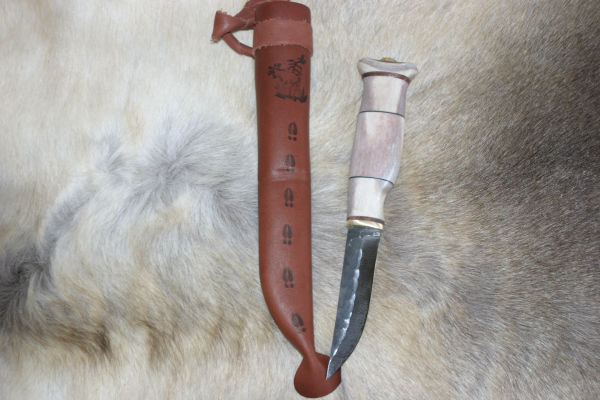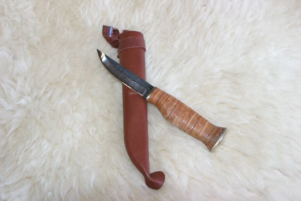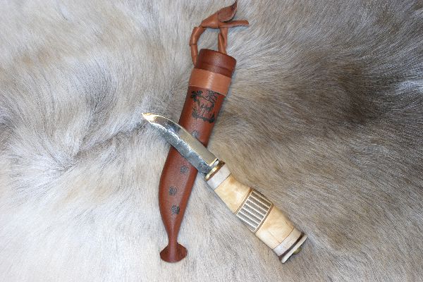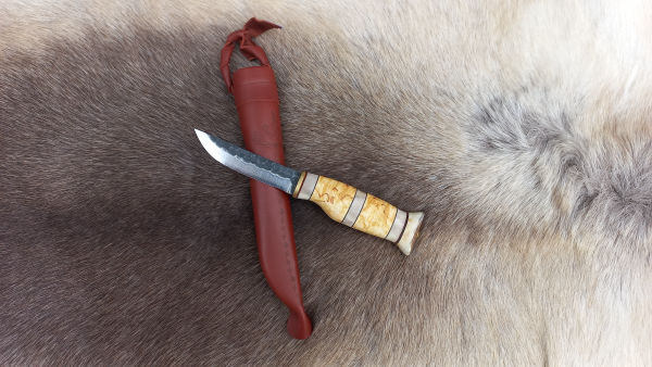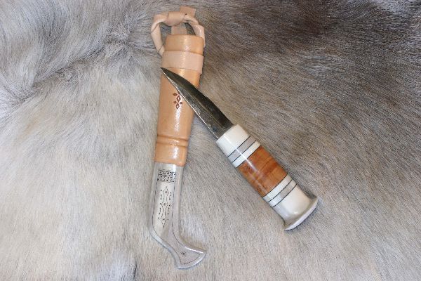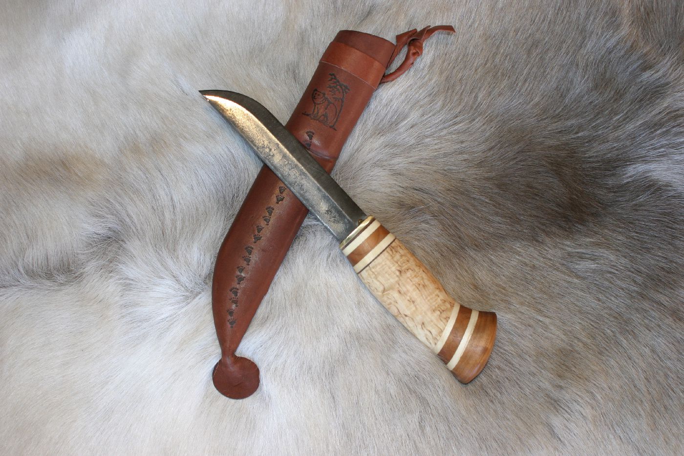 Manche en loupe de bouleau orné de rondelles de bois de renne, fourreau en cuir.