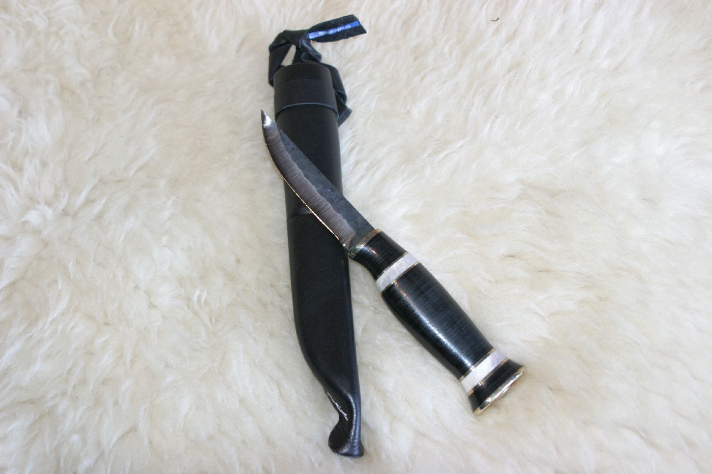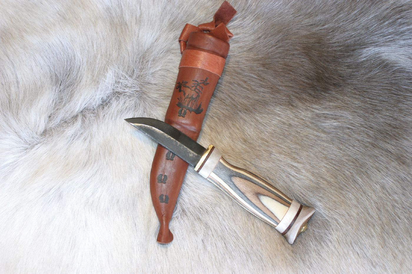 Couteau nordique de chasse, manche en bois de bouleau, rondelles de bois de renne, fourreau en cuir.
