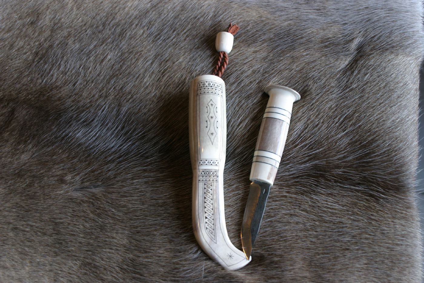 Manche en bois de renne et loupe de bouleau, fourreaux en bois de renne gravé de signes lapon.