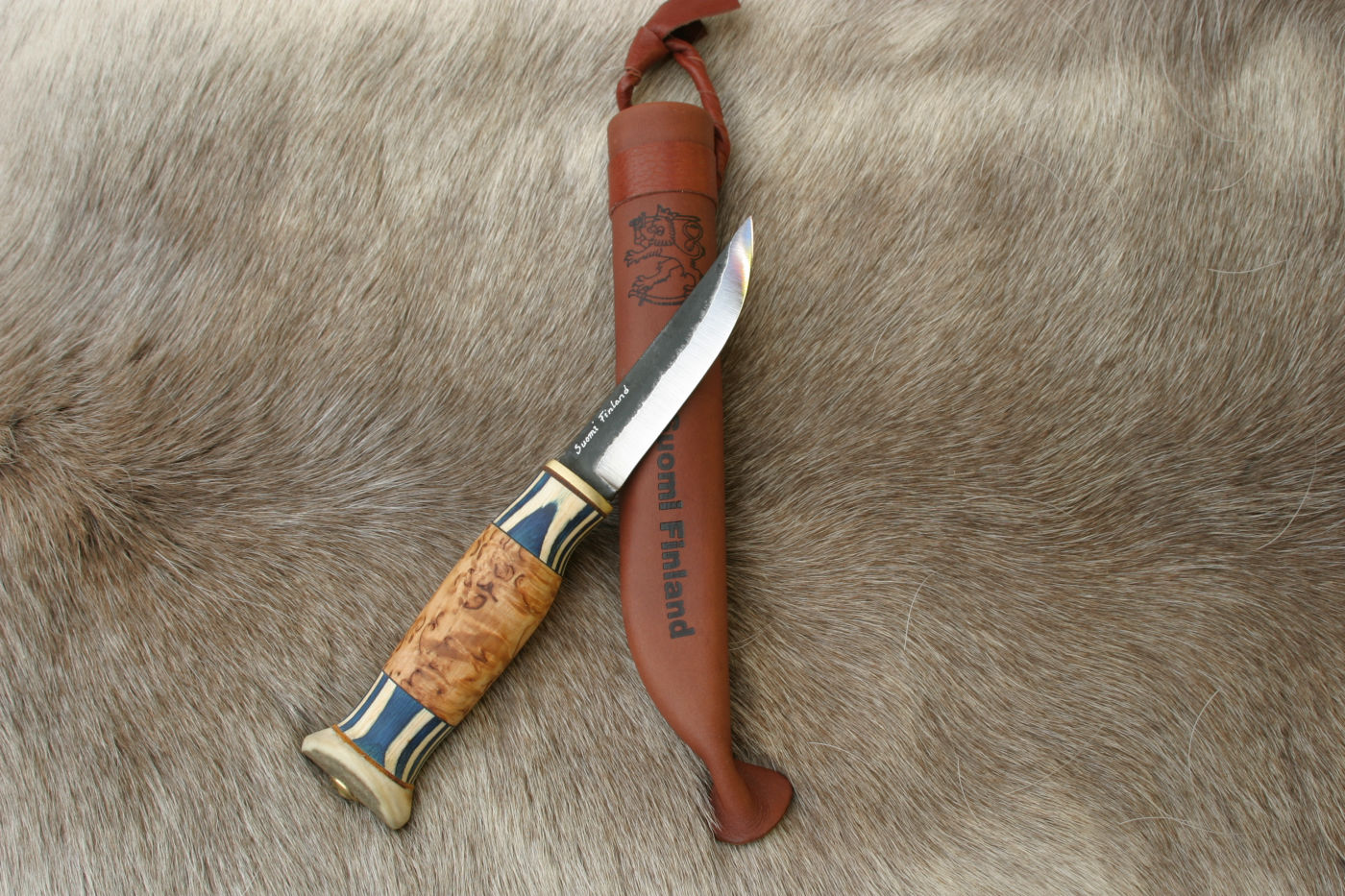 Manche en loupe de bouleau, rayures blanches et bleues , rondelles de bois de renne,lame gravée "Suomi Finland", fourreau en cuir.